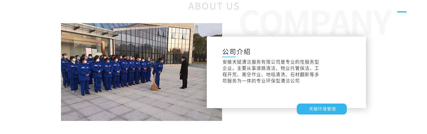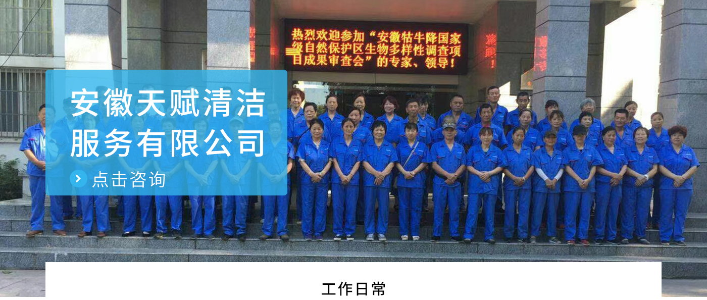 安徽天賦清潔服務(wù)有限公司是的服務(wù)型企業(yè),主要從事道路清潔、物業(yè)托管保潔、工程開荒、高空作業(yè)、地毯清洗、石材翻新等多項服務(wù)為一體的環(huán)保型清潔公司。公司管理機制完善,清潔作業(yè)經(jīng)驗豐富,擁有技術(shù)力量,嚴(yán)格實行崗前培訓(xùn)—崗中督查—上崗在培訓(xùn)的員工管理措施,憑著優(yōu)良的清潔質(zhì)量和嚴(yán)格的督查管理,為眾多企事業(yè)單位、醫(yī)院、酒店、廠區(qū)商場、物業(yè)、道路、學(xué)校、公園等提供后勤清潔服務(wù)。在業(yè)內(nèi)擁有良好的口碑。工作人員,服務(wù)態(tài)度優(yōu),竭力為客戶提供好的保潔服務(wù)。安徽天賦清潔服務(wù)有限公司:致力于長期合作關(guān)系,提高服務(wù)質(zhì)量,提供高標(biāo)準(zhǔn)的清潔服務(wù)。公司的經(jīng)營理念:為營造一個更清潔、亮麗的生活和工作環(huán)境而努力!“誠信”是公司成功保證。“客戶至上,信譽為首”是公司宗旨。高標(biāo)準(zhǔn)提供服務(wù),維護(hù)客戶利益、形象,是我始終不渝的目標(biāo)。